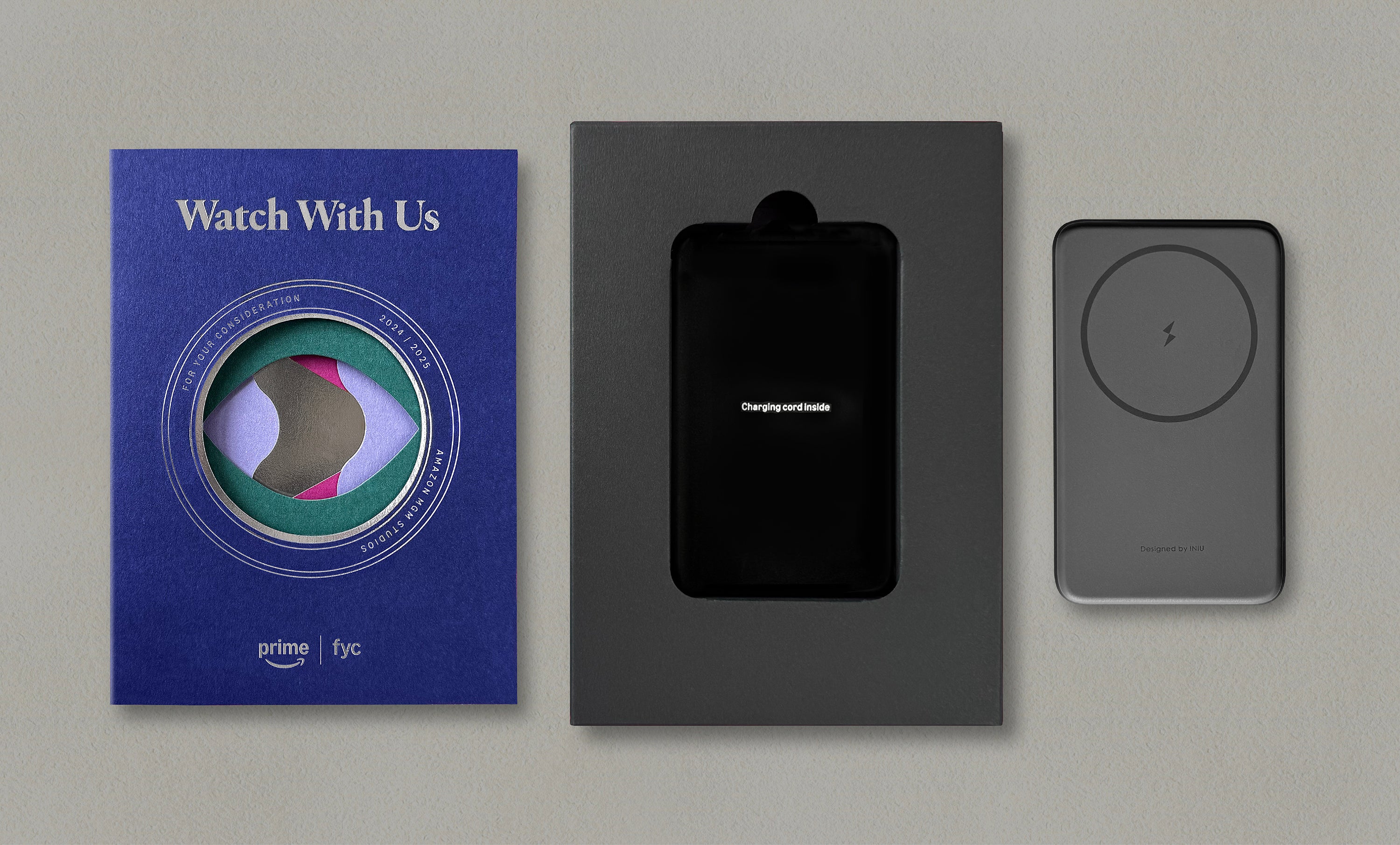 The Awards team at Prime Video asked us to concept and create an elevated, timeless mailer that included a thoughtful, functional gift. We designed a sophisticated invitation that pairs with a sleek phone charging stand. This mailer was designed to help recipients feel ready to watch anytime, anywhere and drive awards voters to ConsiderAmazon.com.